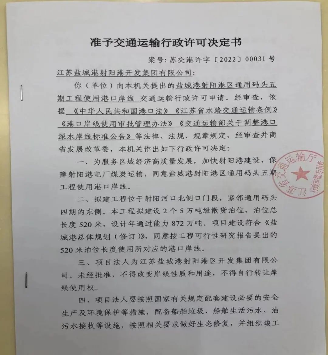 9月16日,鹽城港射陽港區(qū)通用碼頭五期工程岸線取得江蘇省交通運輸廳正式批復。截至目前,該項目前期工可報告、穩(wěn)評、通航安全技術報告、防洪評價、岸線全部通過批復,這標志著項目開工正式邁入“快車道”。