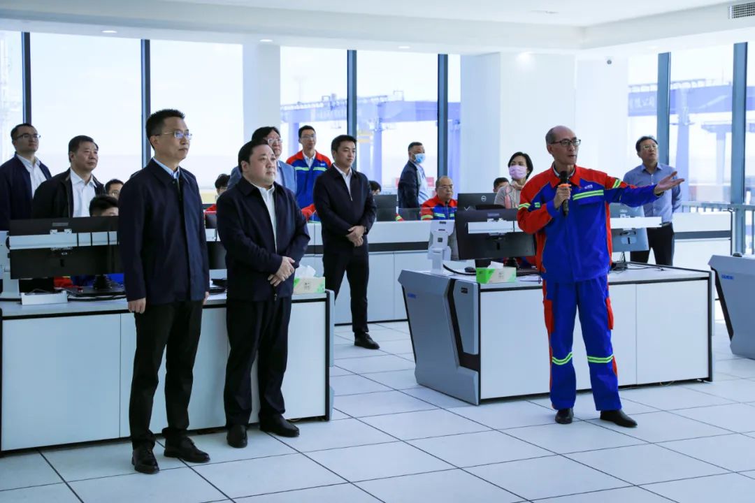 儀式結(jié)束后,與會領(lǐng)導還前往自動化集裝箱堆場指揮中心,詳細聽取現(xiàn)場操作講解,并觀摩堆場運營情況。