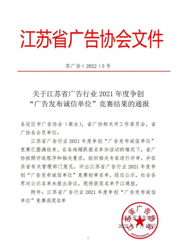 7月16日,2021年度江蘇省廣告行業(yè)廣告發(fā)布誠信單位評選結果公布,江蘇鹽城港文旅集團文化傳媒公司再獲榮譽稱號。
