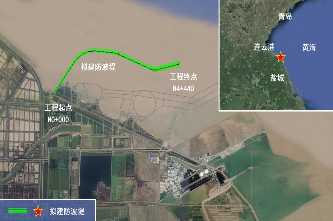 鹽城港濱海港區(qū)北港池防波堤一期工程位于濱海港區(qū)規(guī)劃北港池水域,防波堤與既有防潮大堤相接,接岸點(diǎn)位于蝦須港閘東側(cè)約1km處。工程全長(zhǎng)4440m,分為陸上施工和海上施工兩個(gè)部分。