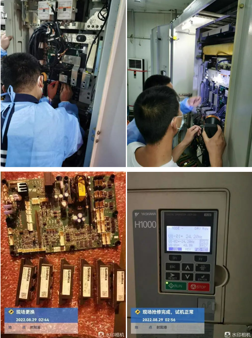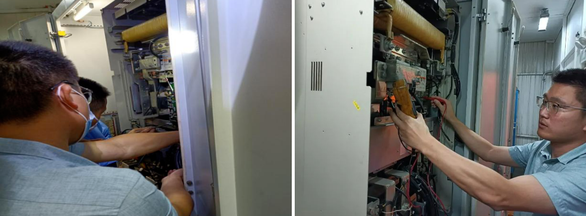 更換備件后,進行上電檢測,發(fā)現設備仍無法正常工作。維修團隊又繼續(xù)排查外部元器件,發(fā)現變頻柜主電源空氣斷路器、主電源接觸器的觸頭燒蝕。為空氣斷路器更換元器件后,又對設備反復進行上電測試,維修團隊持續(xù)奮戰(zhàn)到29日凌晨3點,直至試機正常。