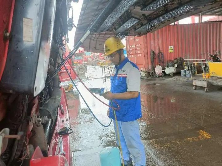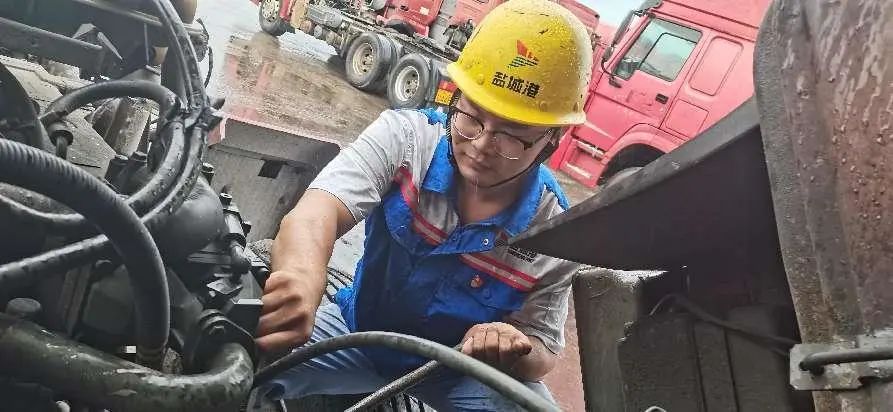 連續(xù)的高溫,讓穿梭于碼頭與堆場(chǎng)的車輛,也會(huì)受不住“中暑生病”,出現(xiàn)散熱不暢、空調(diào)不制冷、控制器高溫等故障。為保證碼頭的正常運(yùn)營(yíng),陸晨不顧已超40℃的體感溫度,戴上工作手套,拿著他的工具箱,打開(kāi)已達(dá)60℃的發(fā)動(dòng)機(jī),用手觸摸每一個(gè)部件來(lái)尋找“癥結(jié)”。汗水不斷滑下,工作服也因汗水而浸濕,緊緊貼在身上,但陸晨全然不顧,只一心一意、專心致志為集卡車“把脈問(wèn)診”。高溫下的時(shí)間總是顯得很緩慢,陸晨擦了檫臉上的汗笑著說(shuō):“我工作10年了,剛開(kāi)始也不適應(yīng),但因?yàn)橄矚g車,慢慢也就習(xí)慣了。”陸晨介紹,除發(fā)動(dòng)機(jī)外,在密閉駕駛室內(nèi)檢修,也是一大考驗(yàn)。車廂外40℃左右的高溫,駕駛室內(nèi)則完全密閉,很多人是受不了的?!叭魏我慌_(tái)集卡車都離不開(kāi)我們修理工?!标懗空f(shuō),“我的任務(wù)就是盡自己最大努力修理車輛,保證碼頭的正常運(yùn)轉(zhuǎn)”。