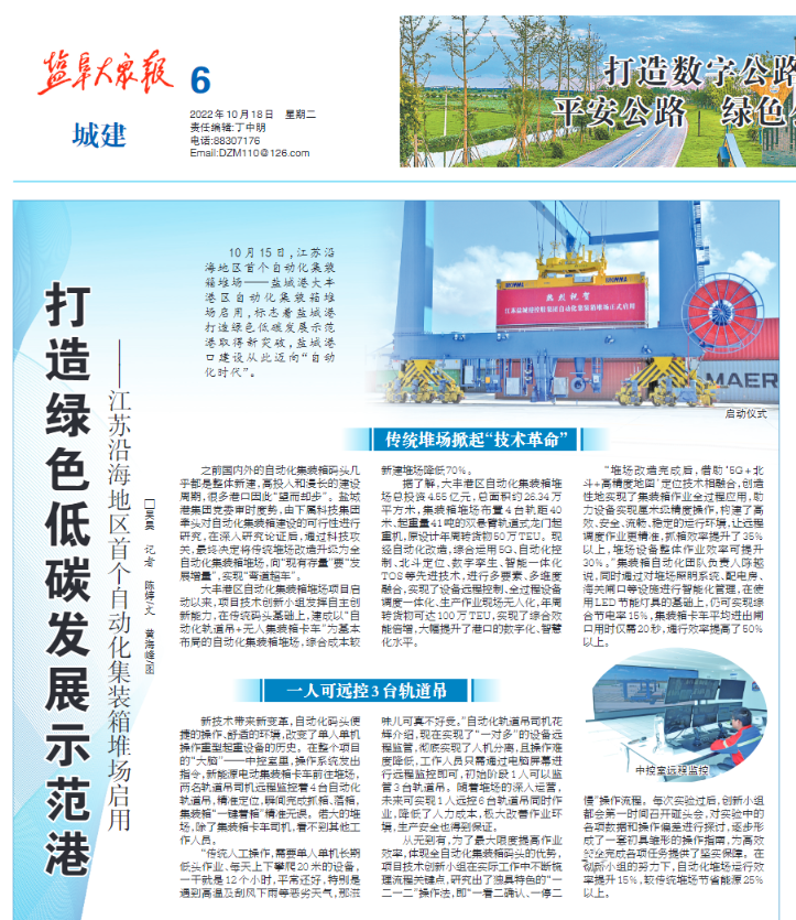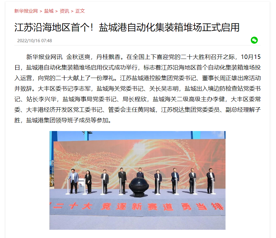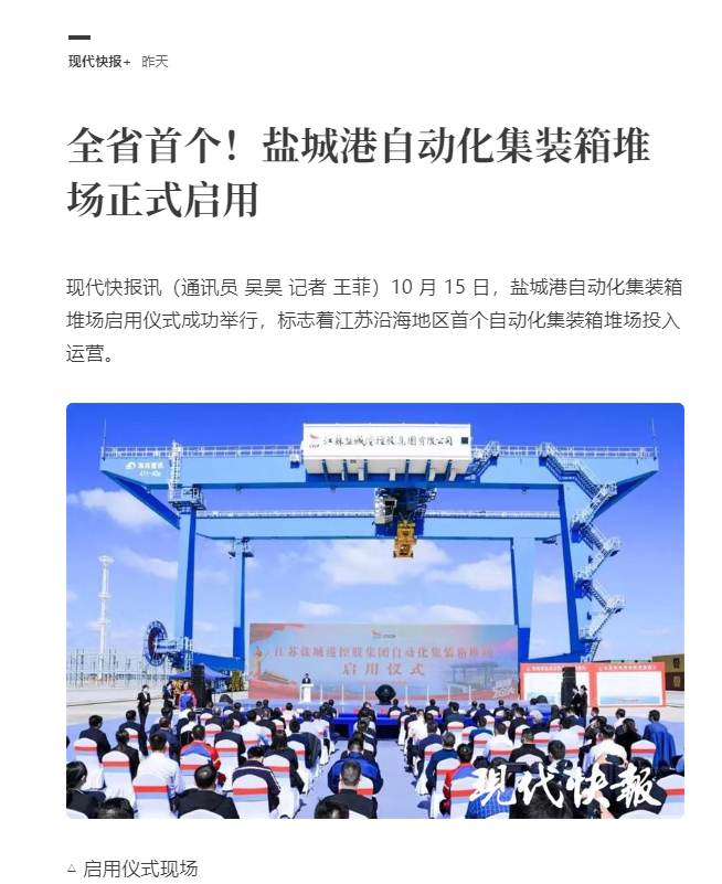 江蘇沿海地區(qū)首個(gè)自動(dòng)化集裝箱堆場(chǎng)——鹽城港大豐港區(qū)自動(dòng)化集裝箱堆場(chǎng)正式啟用