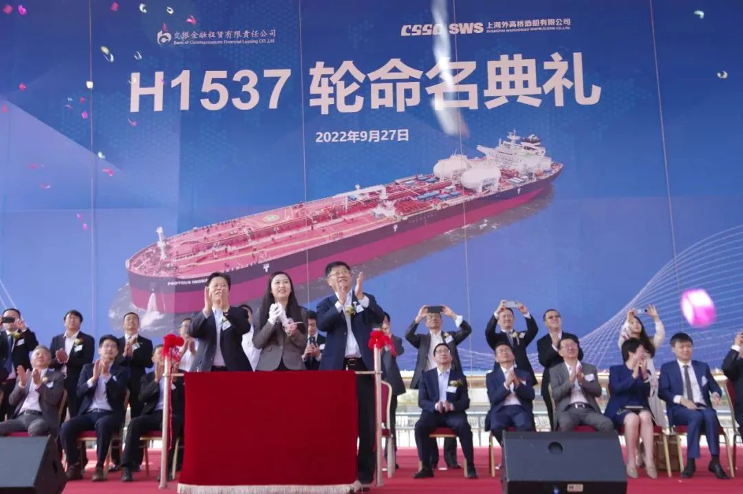 9月27日,交銀金租與外高橋造船合作新造的H1537號(hào)LR2型油輪命名交付。本項(xiàng)目訂造的LR2型成品油輪是目前全球最大的成品油運(yùn)輸船只,是外高橋在大型油輪建造領(lǐng)域的又一重要成果,代表了當(dāng)前世界上成品油輪建造的最高水平,得到了國(guó)際一流貨主殼牌石油和國(guó)際頭部船級(jí)社的一致認(rèn)可。