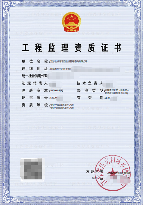 2022年11月18日,項(xiàng)目管理公司獲得由江蘇省住房和城鄉(xiāng)建設(shè)廳頒發(fā)的“房屋建筑工程乙級(jí)和市政公用工程乙級(jí)”兩項(xiàng)工程監(jiān)理資質(zhì)證書,標(biāo)志著公司資質(zhì)申辦工作取得重大進(jìn)展,對(duì)提升公司品牌影響力,提高市場競爭力具有重要的意義。