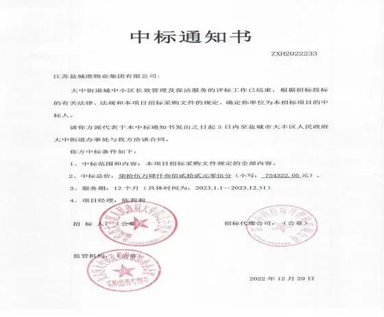 拓市場,保增長,項目業(yè)績創(chuàng)一流。實業(yè)集團(tuán)在提升物業(yè)服務(wù)質(zhì)量、房屋租賃水平,擴(kuò)大鹽城港集團(tuán)“內(nèi)循環(huán)”的同時,逐步向外部市場拓展。1月,黃海港城公司與中天大豐電纜有限公司成功簽訂員工宿舍租賃存量住宅業(yè)務(wù)合同,合同金額近30萬元。物業(yè)公司成功中標(biāo)大中街道城中小區(qū)長效管理及保潔服務(wù),中標(biāo)價約75萬元。