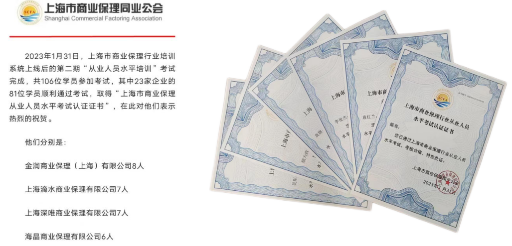 近日,海晶商業(yè)保理有限公司6名員工參加上海市商業(yè)保理水平培訓(xùn),順利通過考試并取得認(rèn)證證書??荚囃ㄟ^人次在上海市商業(yè)保理行業(yè)名列前茅,充分展示了出色的專業(yè)水準(zhǔn)。