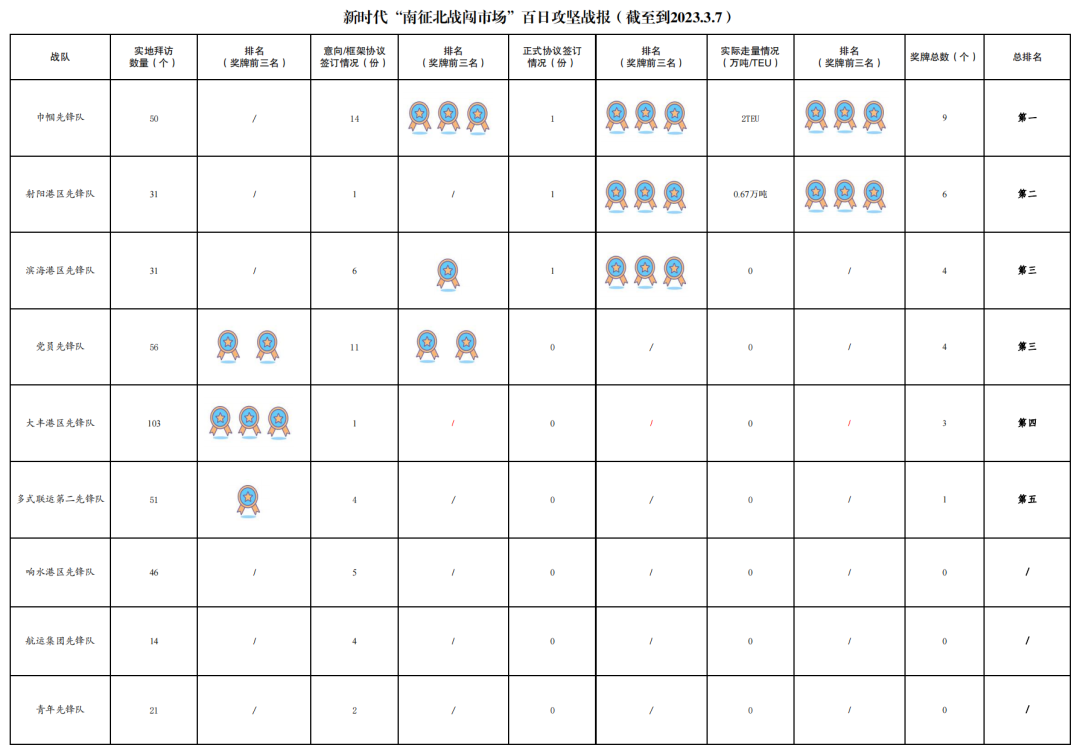 1.累計(jì)拜訪客戶數(shù)量523家:其中大豐港區(qū)先鋒隊(duì)103家,黨員先鋒隊(duì)56家,多式聯(lián)運(yùn)第二先鋒隊(duì)51家,巾幗先鋒隊(duì)50家,建湖港區(qū)先鋒隊(duì)49家,響水港區(qū)先鋒隊(duì)46家,射陽港區(qū)先鋒隊(duì)31家,濱海港區(qū)先鋒隊(duì)31家,亭湖港區(qū)先鋒隊(duì)29家,多式聯(lián)運(yùn)第一先鋒隊(duì)24家,青年先鋒隊(duì)21家,阜寧港區(qū)先鋒隊(duì)18家,航運(yùn)集團(tuán)先鋒隊(duì)14家。