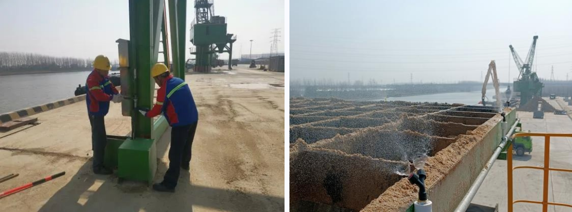港機(jī)公司通過在設(shè)備上加裝高性能微霧裝置和圓錐形高壓微霧噴頭,來感應(yīng)固定吊抓斗移動,當(dāng)抓斗靠近料斗時觸發(fā)距離傳感器,系統(tǒng)自動打開噴霧,從而減少物料裝卸過程中的揚塵,實現(xiàn)散貨作業(yè)抑塵自動化。