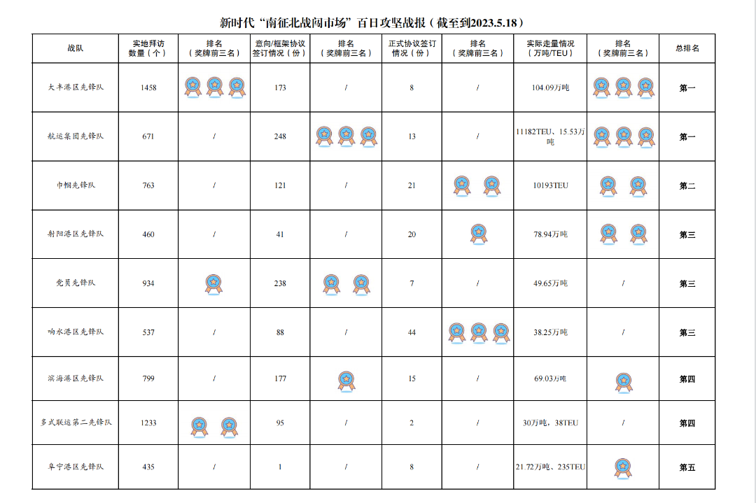 創(chuàng)新方式,激發(fā)活力。于5月15日成功舉辦新時代“南征北戰(zhàn)闖市場”響水港集團(tuán)—國際陸港集團(tuán)“海河聯(lián)運”客戶簽約會,共簽訂30份正式協(xié)議,預(yù)計年中轉(zhuǎn)量680萬噸,預(yù)計年營收3645萬元;于5月18日成功舉辦新時代“南征北戰(zhàn)闖市場”射陽港區(qū)客戶簽約會,共簽訂11份正式協(xié)議,預(yù)計年中轉(zhuǎn)量240萬噸、風(fēng)電葉片153套,預(yù)計年營收3000萬元。