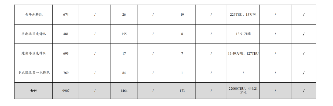 4.實際走量18601TEU、436.71萬噸:其中大豐港區(qū)先鋒隊104.09萬噸,航運集團(tuán)先鋒隊11182TEU、15.53萬噸,射陽港區(qū)先鋒隊78.94萬噸,巾幗先鋒隊10193TEU,濱海港區(qū)先鋒隊69.03萬噸,阜寧港區(qū)先鋒隊21.72萬噸、235TEU,黨員先鋒隊49.65萬噸,青年先鋒隊225TEU、15萬噸,響水港區(qū)先鋒隊38.25萬噸,建湖港區(qū)先鋒隊13.49萬噸、127TEU,亭湖港區(qū)先鋒隊13.51萬噸,多式聯(lián)運第二先鋒隊30萬噸,38TEU。