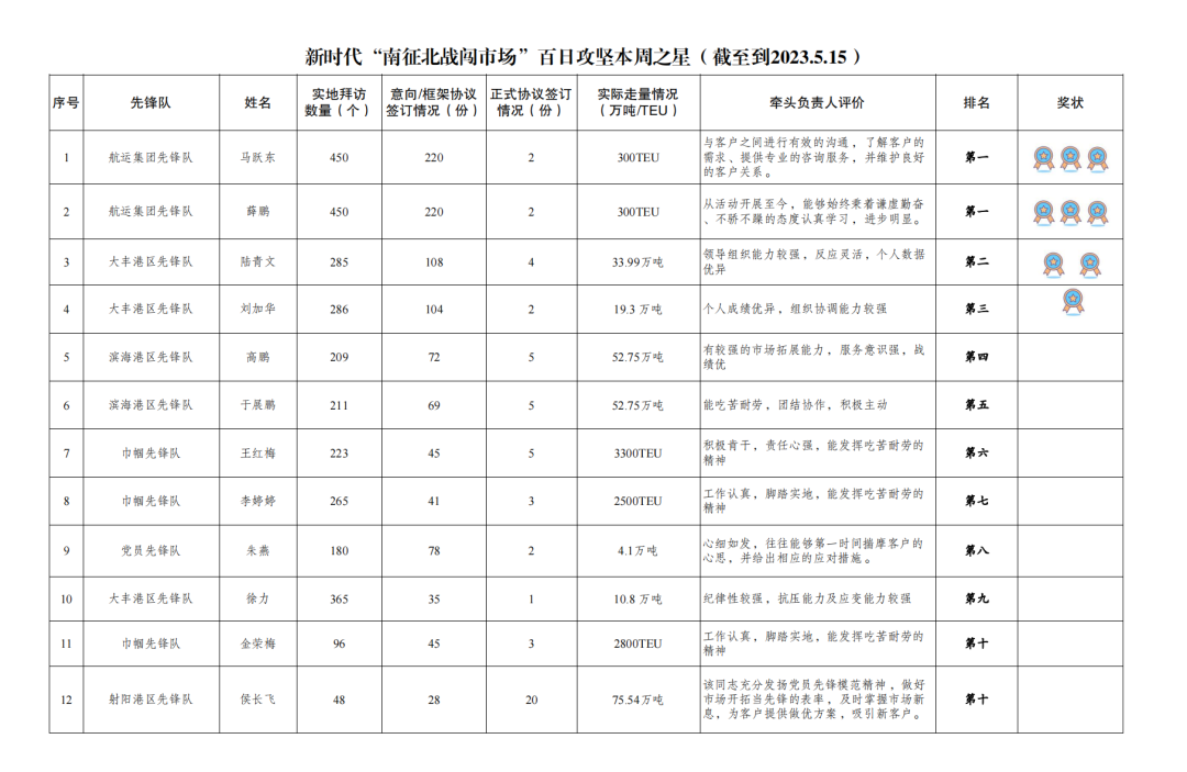 第一名:航運集團(tuán)先鋒隊 馬躍東、薛鵬(拜訪客戶450家,簽訂意向協(xié)議220份,簽訂正式協(xié)議2份,實際走量300TEU)