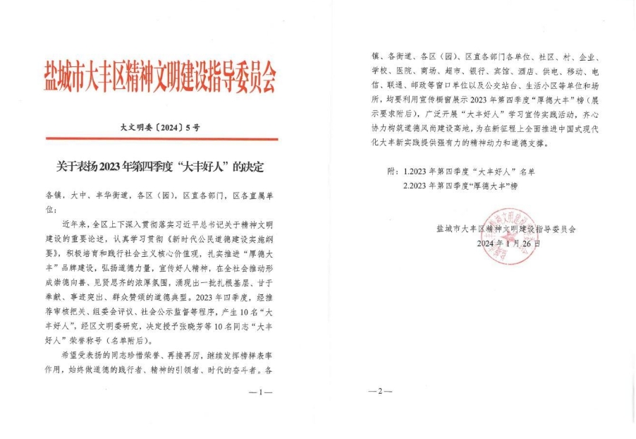 近日,鹽城市大豐區(qū)大力培育和踐行社會(huì)核心價(jià)值觀,積極開展2023年第四季度“大豐好人”推薦評選表彰活動(dòng),著力唱響“厚德大豐”品牌。經(jīng)推薦審核把關(guān)、組委會(huì)評議、社會(huì)公示監(jiān)督等程序,江蘇鹽城港港泊半島酒店有限公司張曉芳同志被授予“大豐好人”榮譽(yù)稱號(hào)。