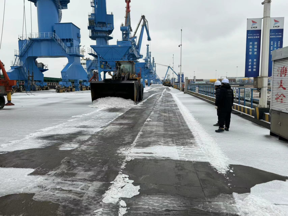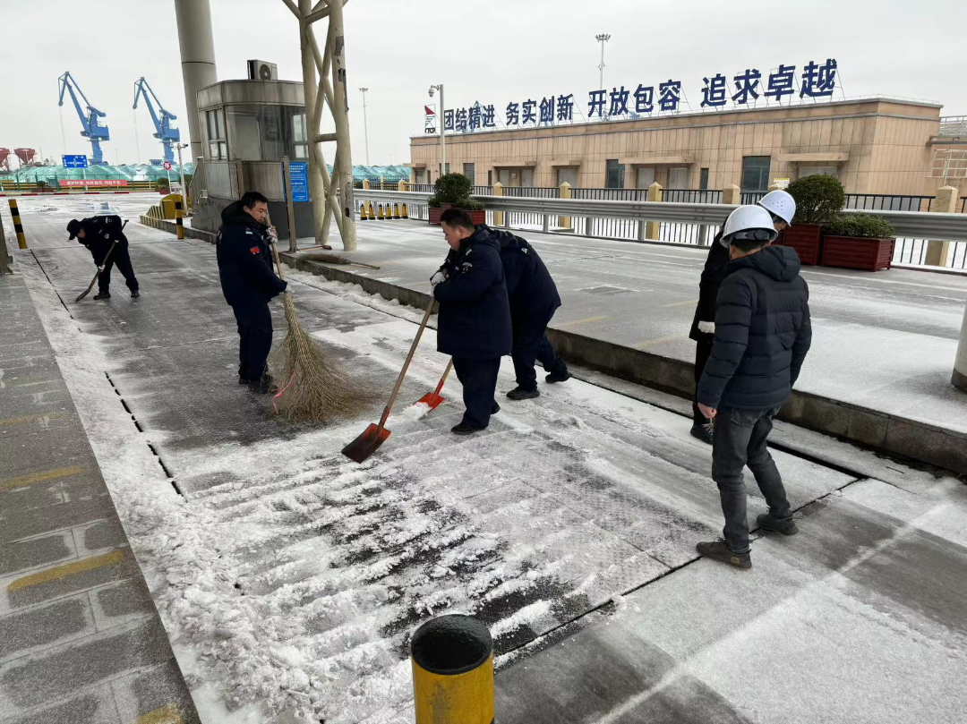 為排除現(xiàn)場積雪,防止道路結(jié)冰帶來的安全隱患,響水港區(qū)采取“機械+人工”協(xié)同作業(yè)模式,對港區(qū)重點區(qū)域、主要道路和交通要道等進行清掃,同時根據(jù)道路積雪情況,適時組織拋撒融雪劑,全力以赴保障港區(qū)道路暢通及職工出行安全。