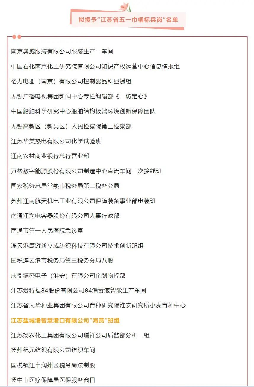 “江蘇省五一巾幗標兵”名單公示