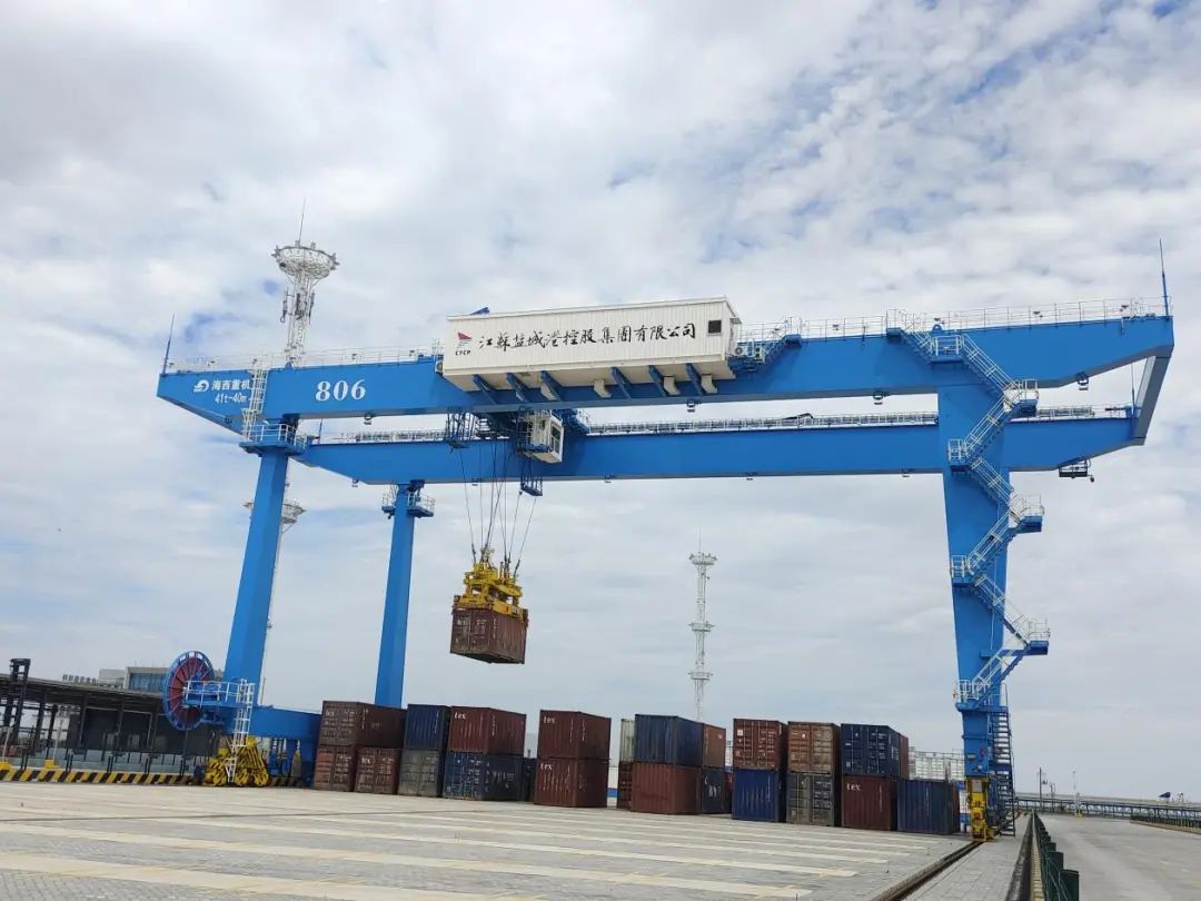 龍門式起重機(俗稱龍門吊),是橋架通過兩側支腿支撐在地面軌道上的橋架型起重機。在港口,主要用于室外的貨場、料場貨、散貨的裝卸作業(yè)。它的金屬結構像門形框架,承載主梁下安裝兩條支腳,可以直接在地面的軌道上行走,主梁兩端可以具有外伸懸臂梁。龍門式起重機具有場地利用率高、作業(yè)范圍大、適應面廣、通用性強等特點,鹽城響水重件碼頭額定負荷達到600T,能滿足起吊幾乎所有常見港口裝卸物資。