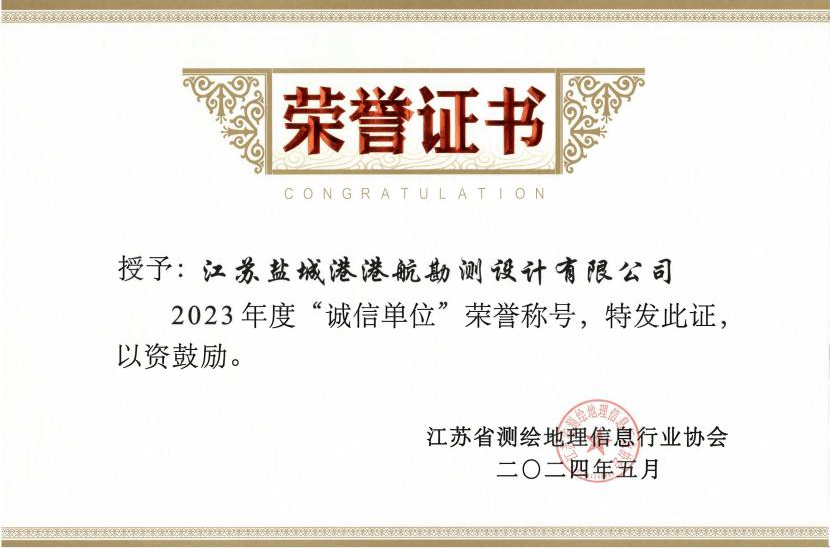 近日,江蘇省測(cè)繪地理信息學(xué)會(huì)公布2023年度“誠(chéng)信單位”評(píng)定結(jié)果名單,江蘇鹽城港港航勘測(cè)設(shè)計(jì)有限公司被評(píng)為2023年度“誠(chéng)信單位”,這一榮譽(yù)彰顯了業(yè)界對(duì)勘測(cè)設(shè)計(jì)公司經(jīng)營(yíng)管理和信用體系建設(shè)等方面的認(rèn)可,更是對(duì)勘測(cè)設(shè)計(jì)公司在測(cè)繪地理信息領(lǐng)域誠(chéng)信經(jīng)營(yíng)、優(yōu)質(zhì)服務(wù)的肯定,對(duì)于助推市場(chǎng)經(jīng)營(yíng)和品牌打造起到積極作用。