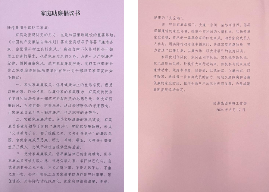 家庭齊心助廉?!盀檫M(jìn)一步嚴(yán)明廉潔紀(jì)律、筑牢家庭廉政防線,黨群工作部向全體陸港集團(tuán)干部職工家庭發(fā)出如下倡議……”在警示教育大會(huì)上,陸港集團(tuán)黨群工作部向全體干部職工發(fā)出了《家庭助廉倡議書》,引導(dǎo)干部職工家屬常吹“家庭廉潔風(fēng)”,做好“家庭廉內(nèi)助”,把好“家庭廉潔門”,以清廉家風(fēng)抵御腐敗歪風(fēng),齊心協(xié)力,共同織密“家庭護(hù)廉網(wǎng)”。