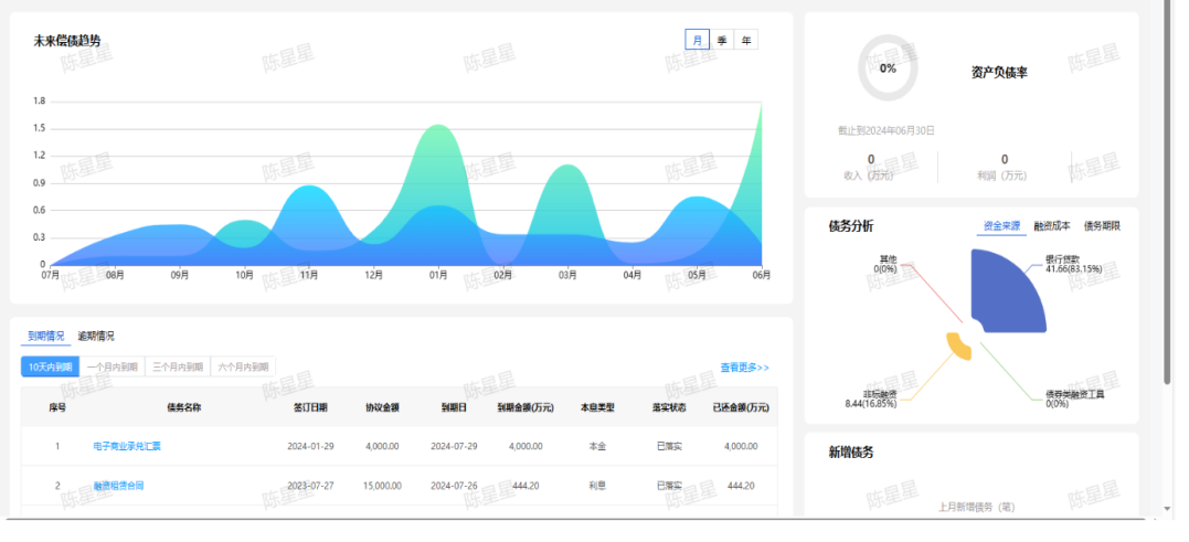 為實(shí)現(xiàn)財(cái)務(wù)標(biāo)準(zhǔn)化,每一筆融資發(fā)生后,第一時(shí)間將貸款的所有數(shù)據(jù)更新至系統(tǒng),實(shí)現(xiàn)每一筆還款無遺漏,保證資金還款的安全性。同時(shí),系統(tǒng)可生成債務(wù)結(jié)構(gòu),通過直觀的餅狀圖顯示,了解港區(qū)的債務(wù)情況,及時(shí)作出合理提款計(jì)劃,調(diào)優(yōu)融資結(jié)構(gòu)。