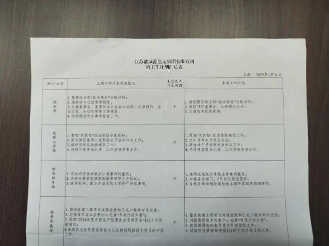 堅持每周一召開工作例會,學習鹽城港集團黨委會“第一議題”相關(guān)文件、研究交辦事項完成情況及近期重點工作任務推進情況。采用“三言兩語”匯報機制,各部門(單位)負責人逐一匯報重點工作完成情況及本周工作計劃,分管領(lǐng)導補充完善,主要領(lǐng)導結(jié)合集團黨委部署,圍繞航運集團發(fā)展實際,就重點工作事項再部署、再強調(diào),進一步提高思想認識,增強做好當前各項重點工作的責任感和緊迫感,牢固樹立“一盤棋”思想,夯實工作責任,細化工作舉措,確保有序推進。