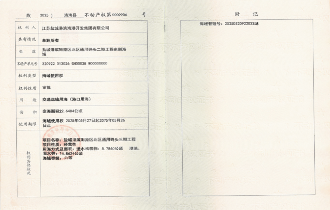 此次海域使用證的獲批,標(biāo)志著濱海港區(qū)北區(qū)通用碼頭三期工程在建設(shè)進(jìn)程中邁出了堅(jiān)實(shí)一步,也為鹽城港的發(fā)展注入了新活力,助力其在區(qū)域經(jīng)濟(jì)發(fā)展中發(fā)揮更大作用。