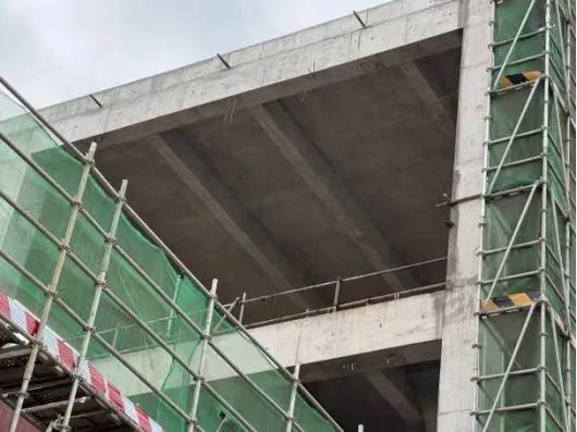 混凝土結(jié)構(gòu)施工區(qū)域,淺棕色木方違規(guī)傾斜堆放于臨邊圍擋處,遇外力(如碰撞、大風(fēng))易發(fā)生墜落,威脅下方作業(yè)人員安全。