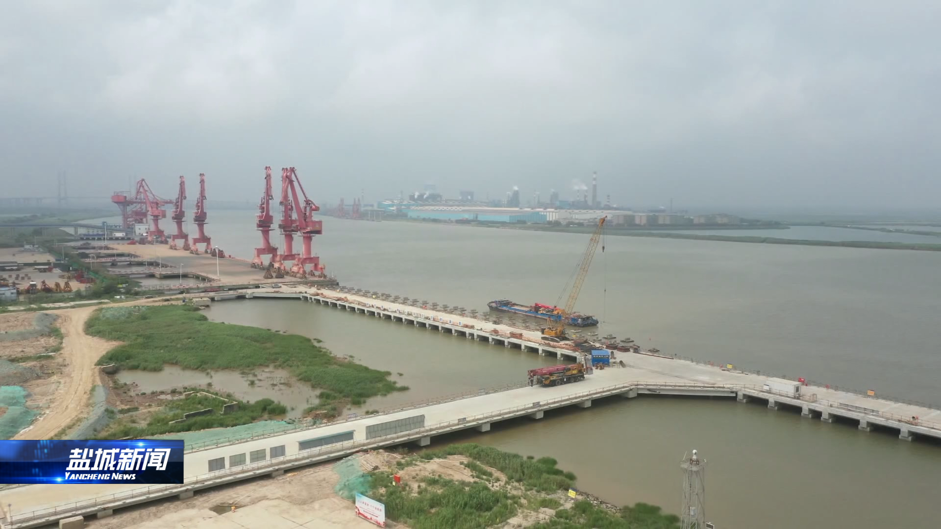 鏡頭轉(zhuǎn)向鹽城港濱海港區(qū)主港池北區(qū)通用碼頭三期工程施工現(xiàn)場,航運碼頭已初具規(guī)模。堆場區(qū)域工人正安裝路緣石,灑水車穿梭養(yǎng)護。據(jù)項目負責(zé)人介紹,目前項目每天投入30余人及10余臺設(shè)備,搶抓進度,確保7月按計劃進行道路面層施工和港池開挖。